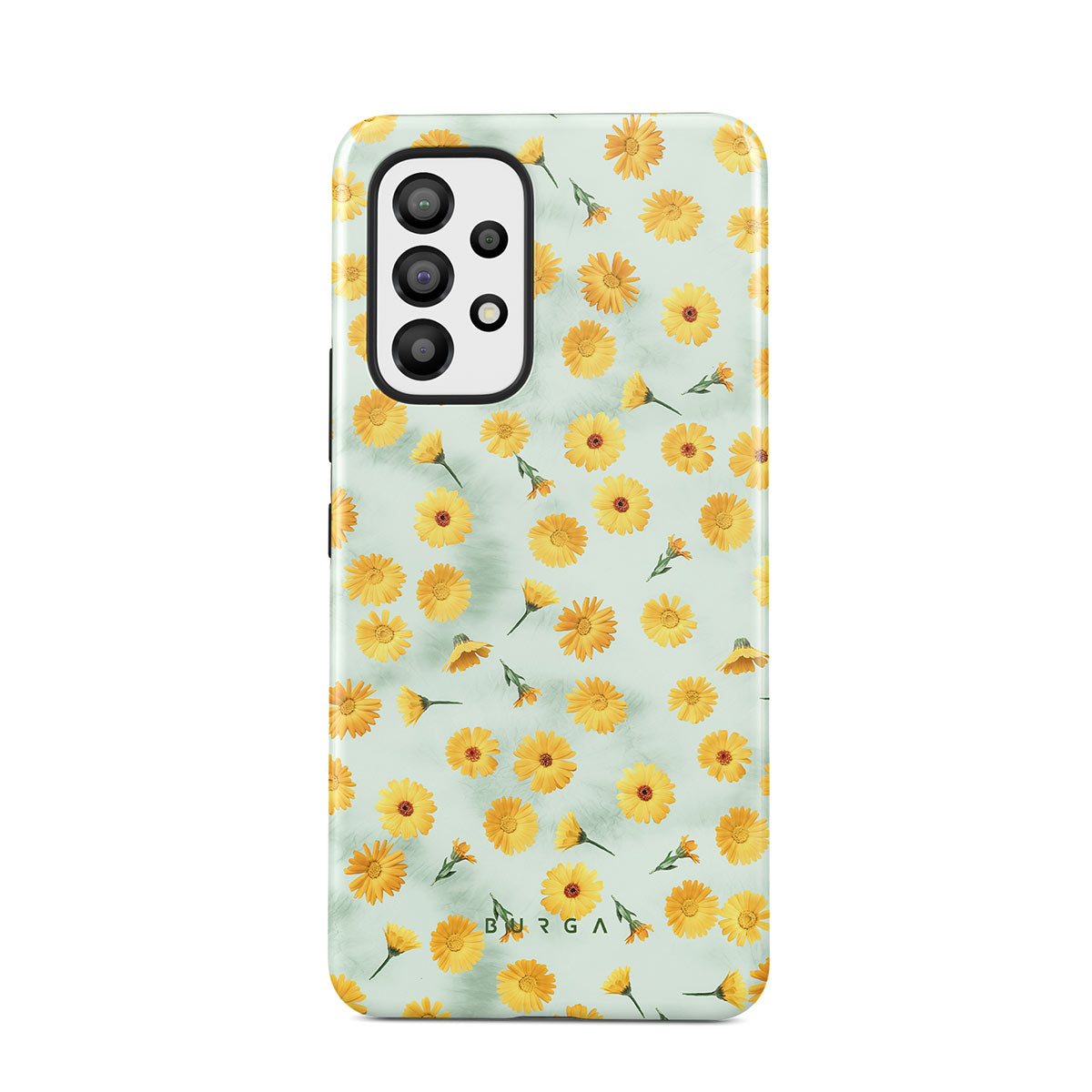 In our Sanctuary of Love Samsung Galaxy A23 4G / 5G phone case, a soft mint marble meets a glowing pattern of yellow flowers that will surely add a splash of energy to your style while protecting your phone from dangerous falls.