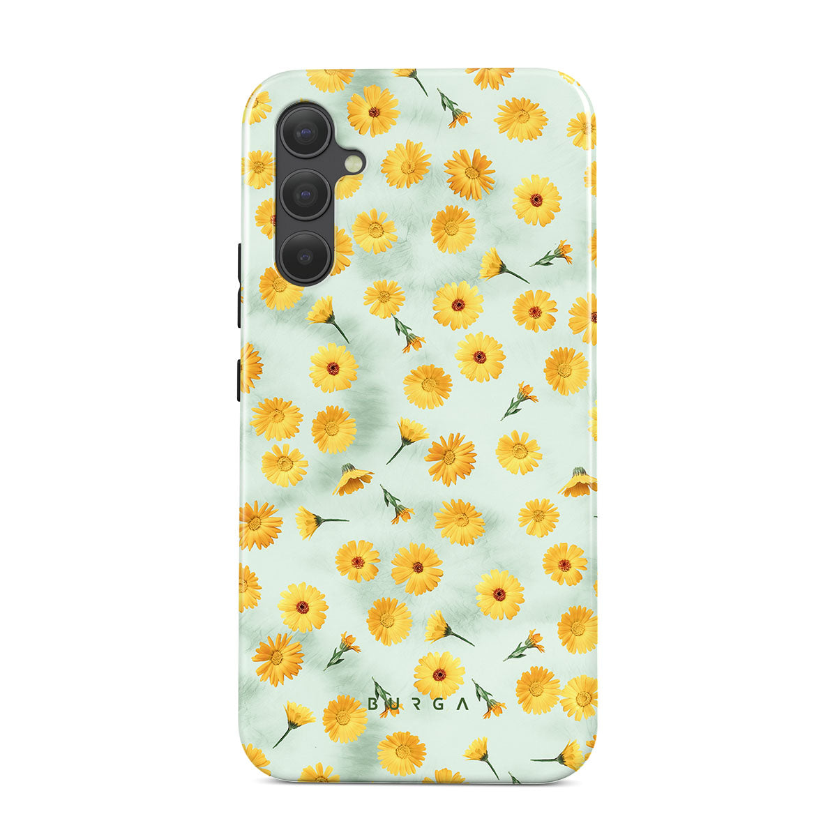 In our Sanctuary of Love Samsung Galaxy A34 phone case, a soft mint marble meets a glowing pattern of yellow flowers that will surely add a splash of energy to your style while protecting your phone from dangerous falls.