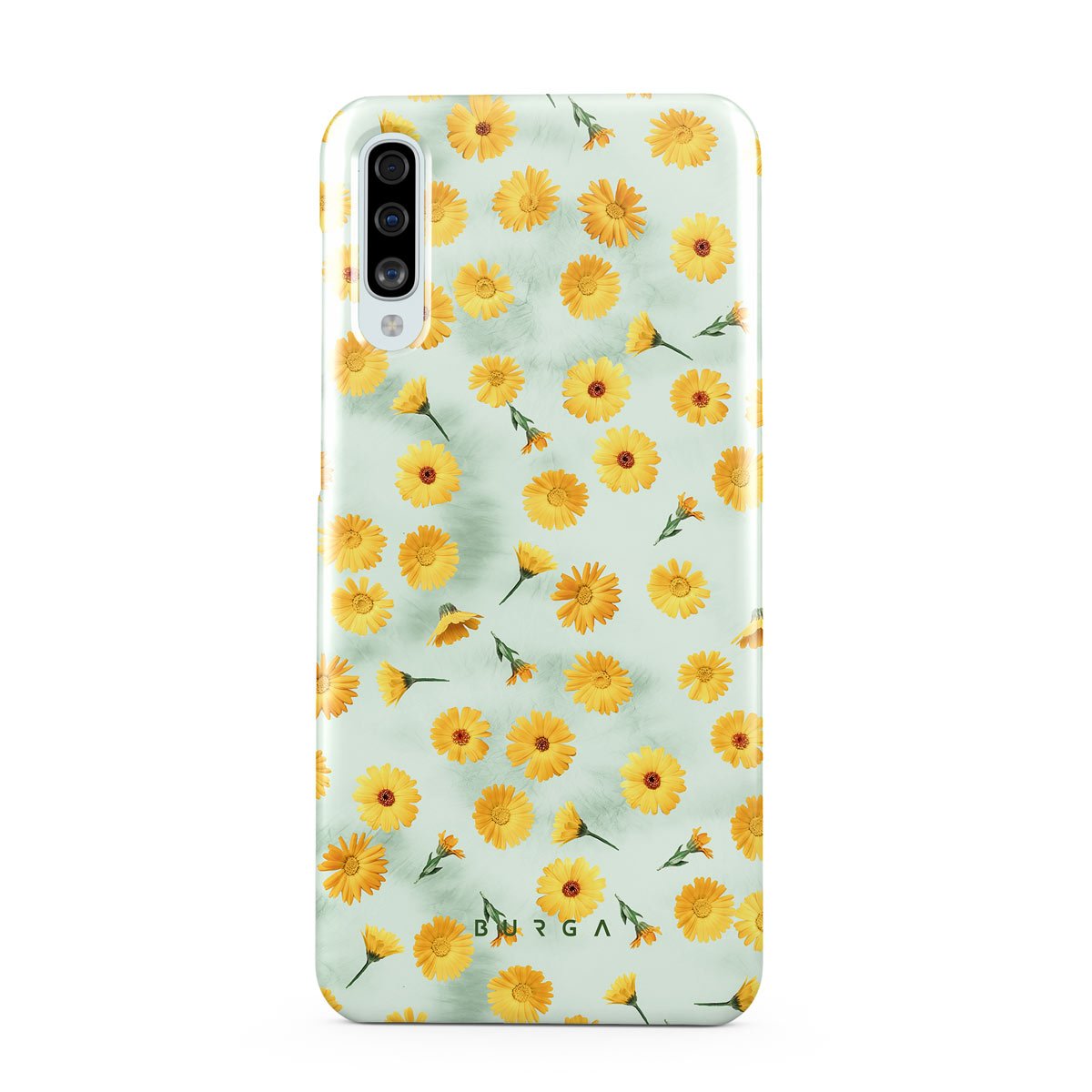 In our Sanctuary of Love Samsung Galaxy A50 phone case, a soft mint marble meets a glowing pattern of yellow flowers that will surely add a splash of energy to your style while protecting your phone from dangerous falls.