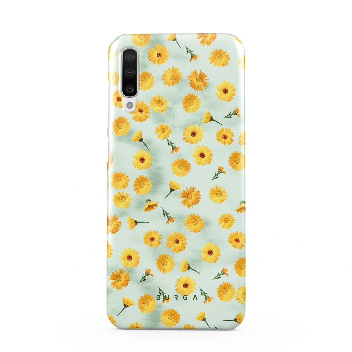 In our Sanctuary of Love Samsung Galaxy A70 phone case, a soft mint marble meets a glowing pattern of yellow flowers that will surely add a splash of energy to your style while protecting your phone from dangerous falls.