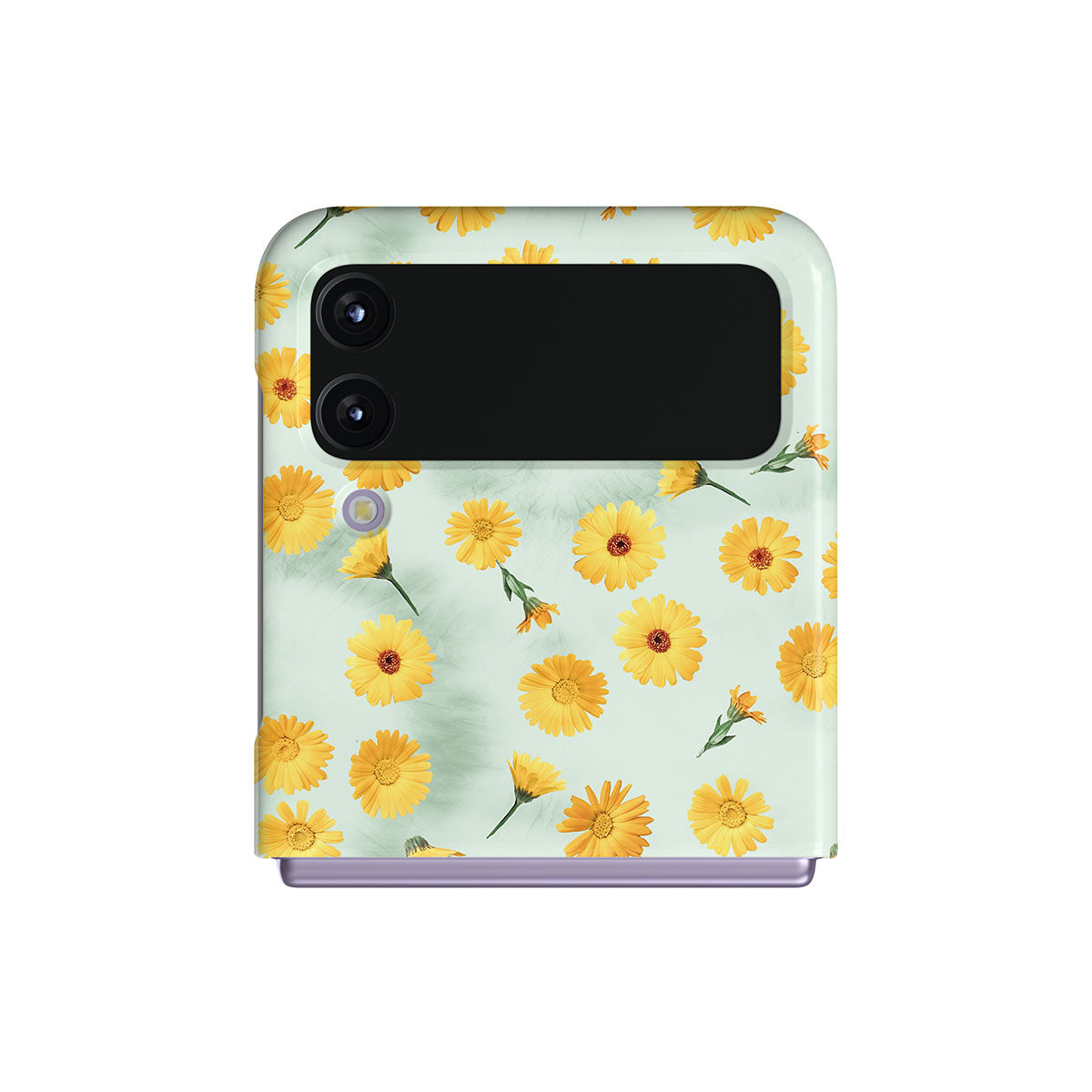 In our Sanctuary of Love Samsung Galaxy Z Flip 4 phone case, a soft mint marble meets a glowing pattern of yellow flowers that will surely add a splash of energy to your style while protecting your phone from dangerous falls.