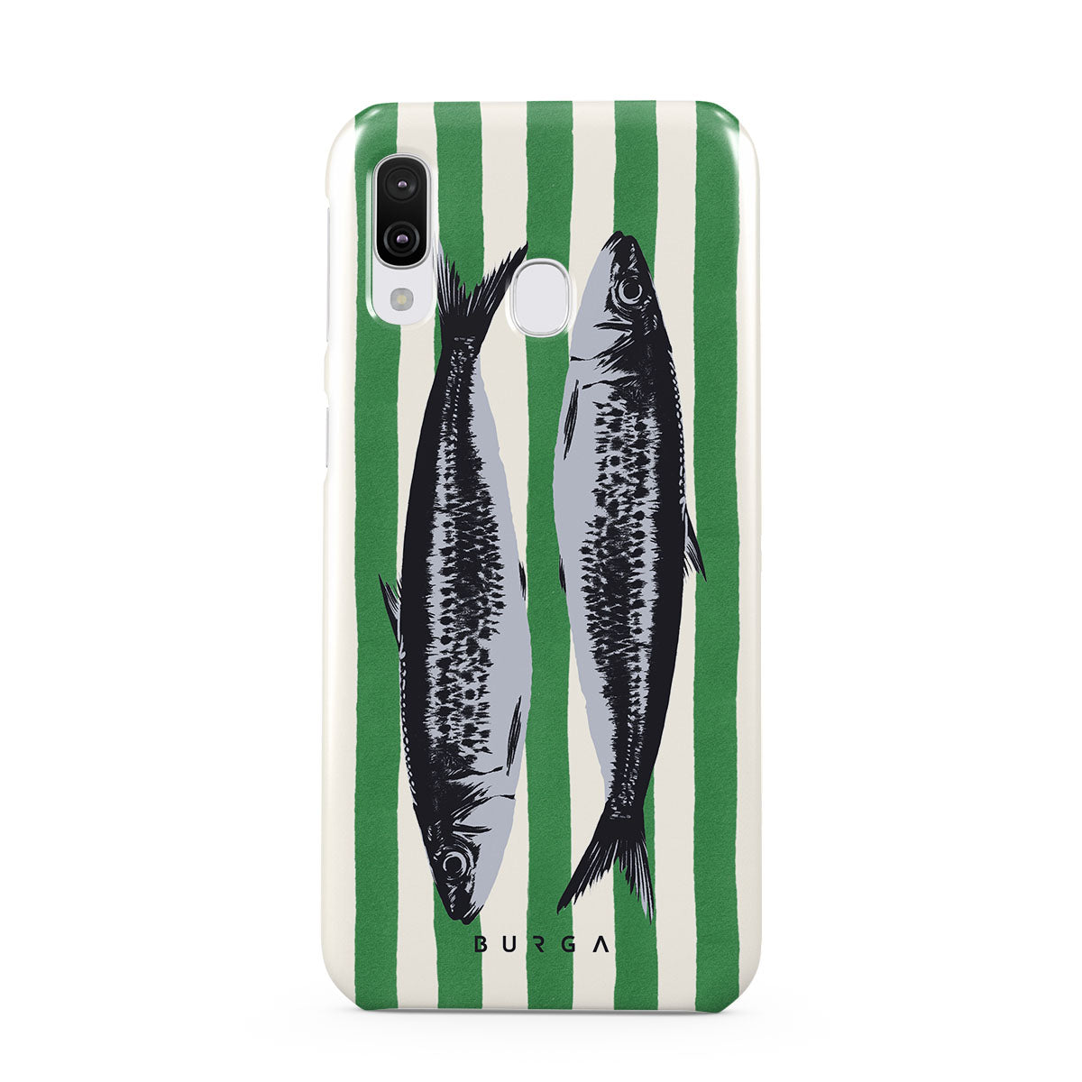 This design features: Sardines, green stripes, ocean motifs