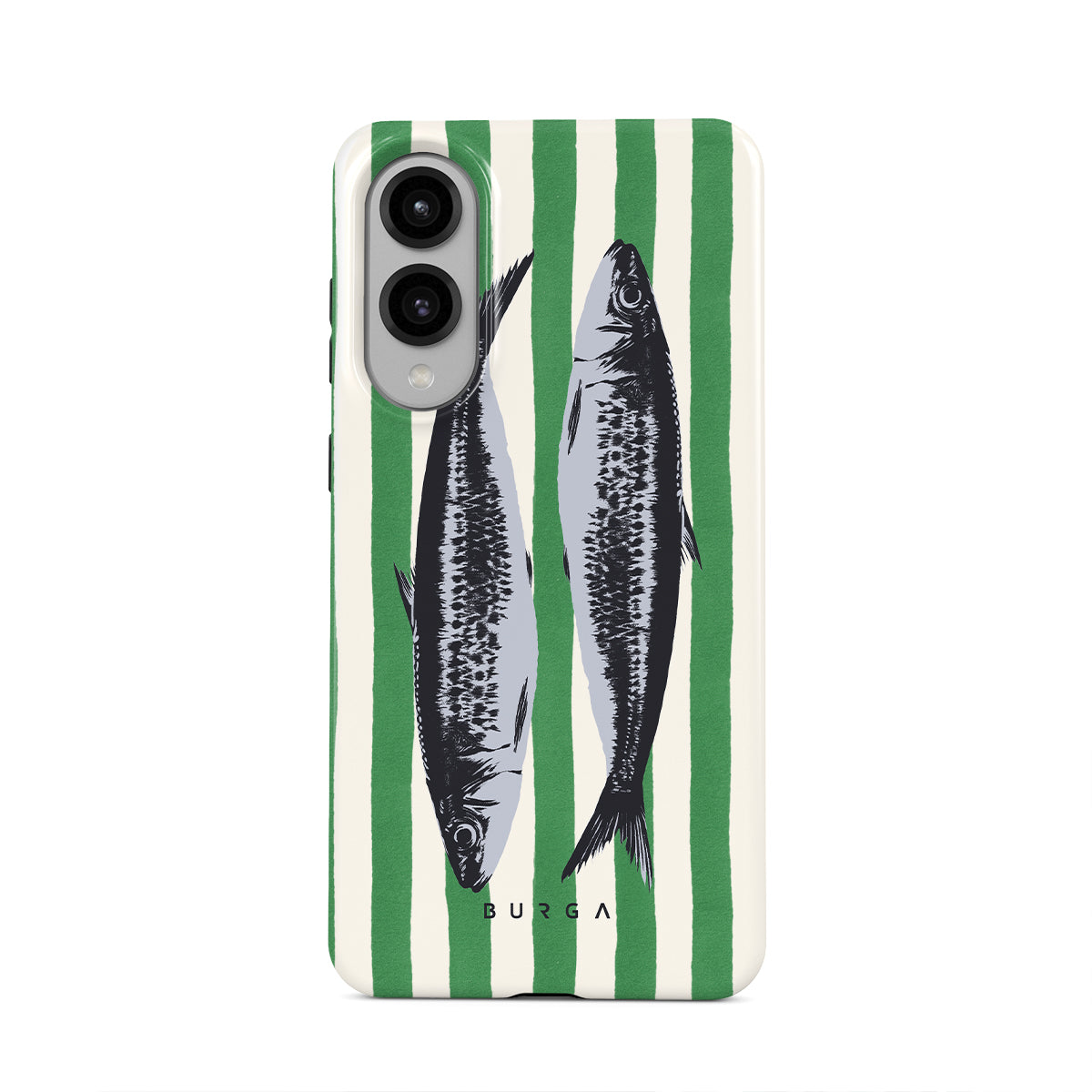 This design features: Sardines, green stripes, ocean motifs