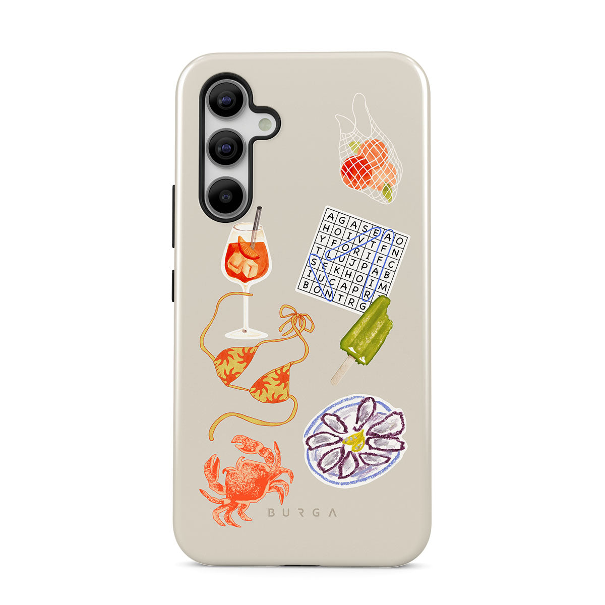 This design features: crab, oysters plate, popsicle, crossword puzzle, spritz cocktail, bikini top, fruits