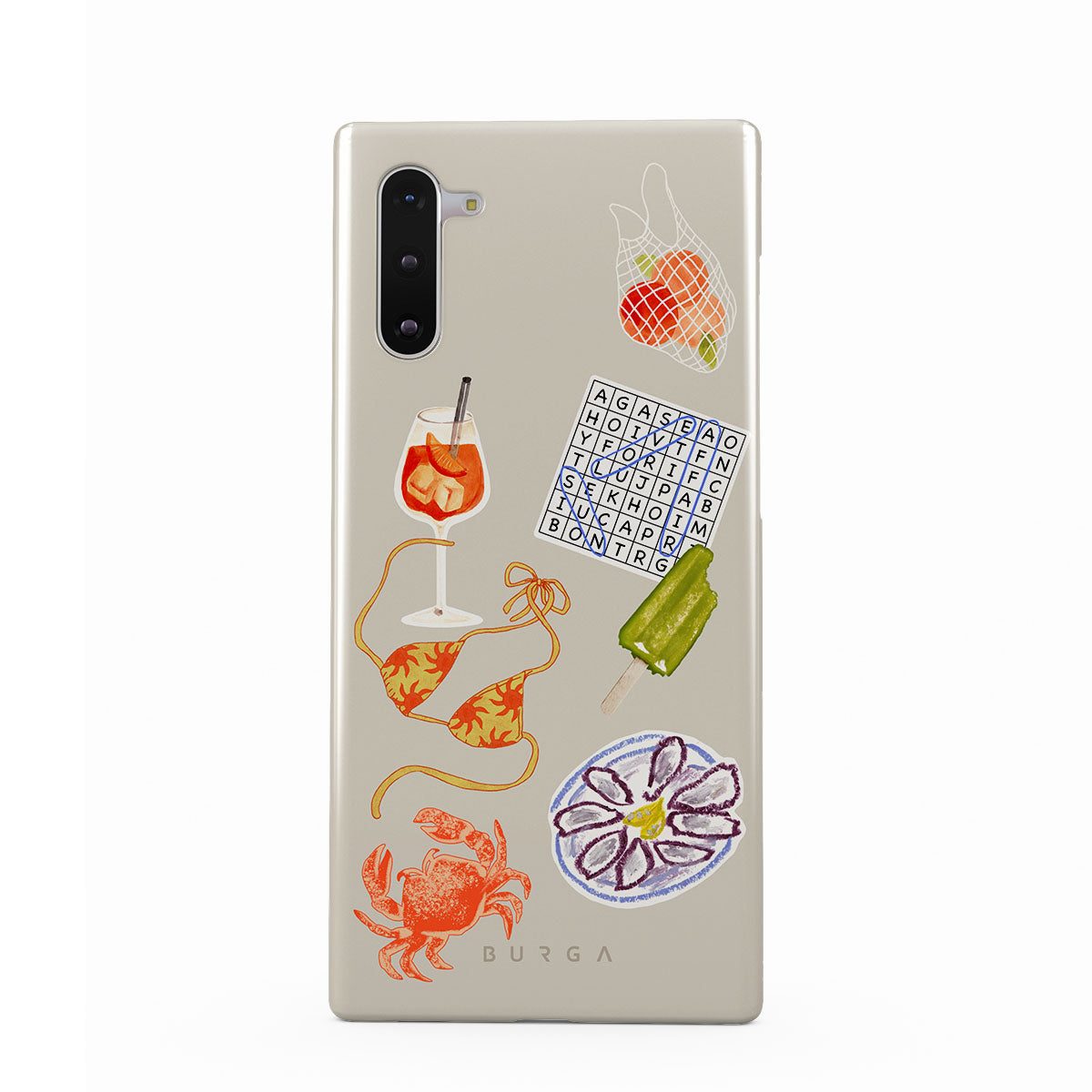 This design features: crab, oysters plate, popsicle, crossword puzzle, spritz cocktail, bikini top, fruits