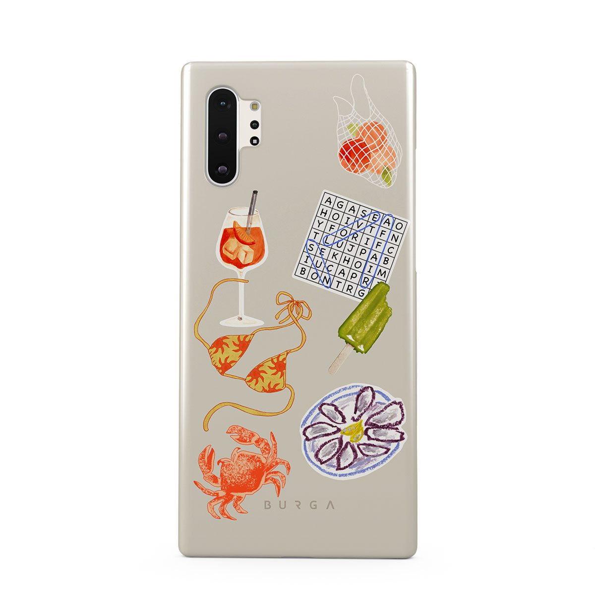 This design features: crab, oysters plate, popsicle, crossword puzzle, spritz cocktail, bikini top, fruits