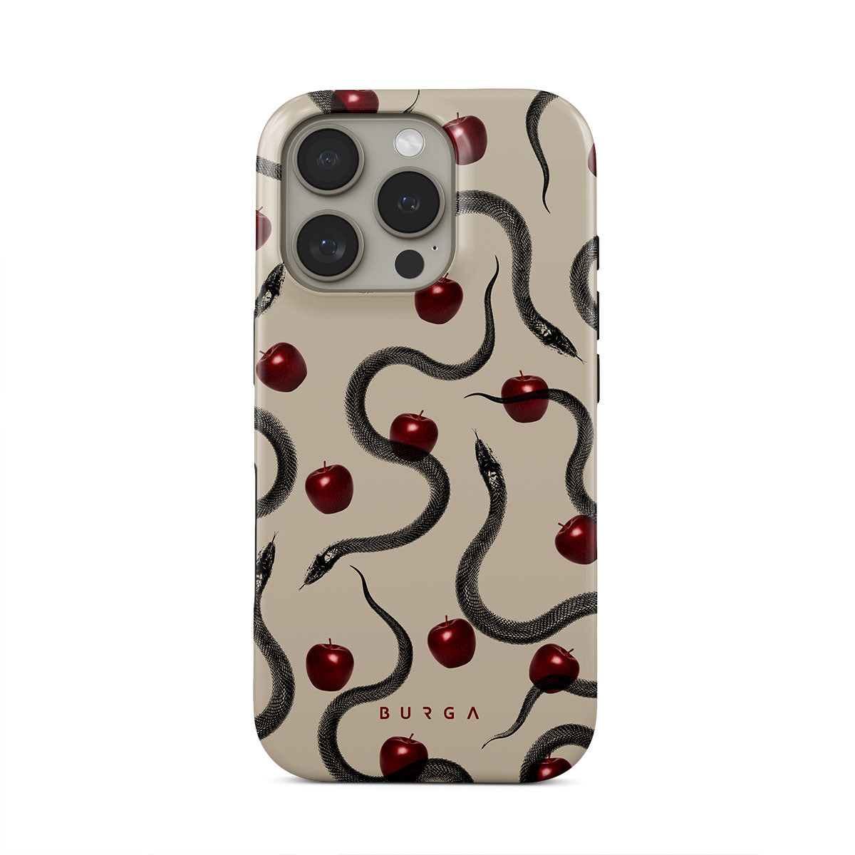 This design features: glossy red apples, coiled serpents, beige tones