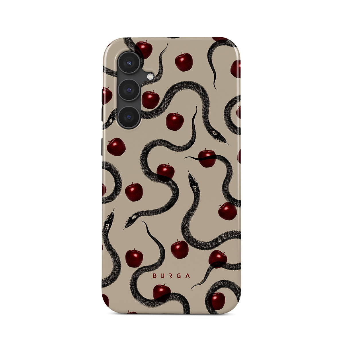 This design features: glossy red apples, coiled serpents, beige tones