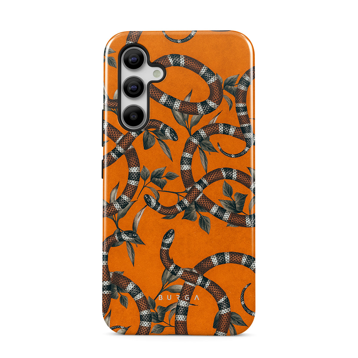 Take a bit of fierceness with yourself with our bright orange and dangerously beautiful Samsung Galaxy A55 phone case with a snake pattern. This case is real eye candy for fashion lovers and just as needed for those who strive to keep their phones protected.