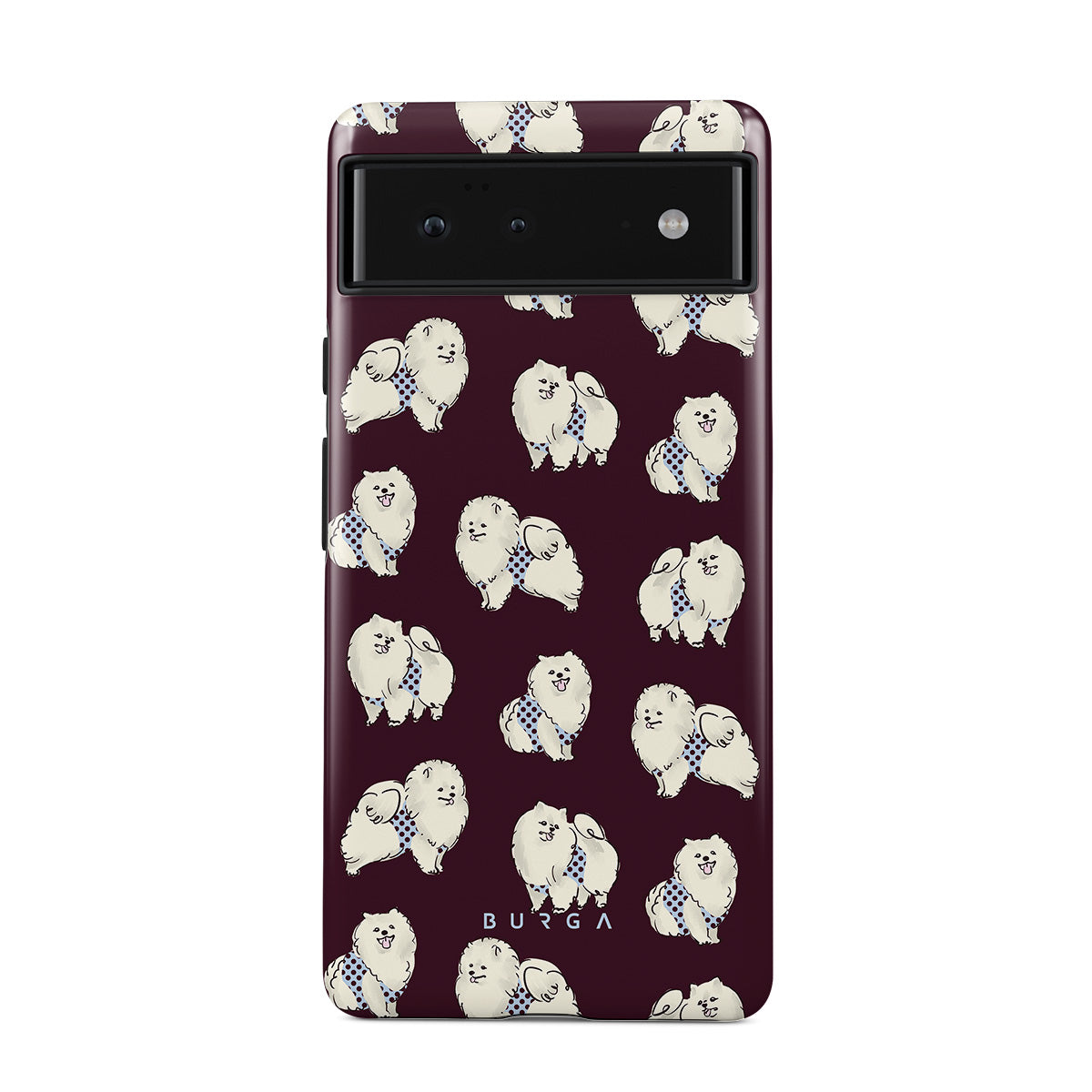 This design features: white fluffy dogs on a deep burgundy background, poodles, pets.