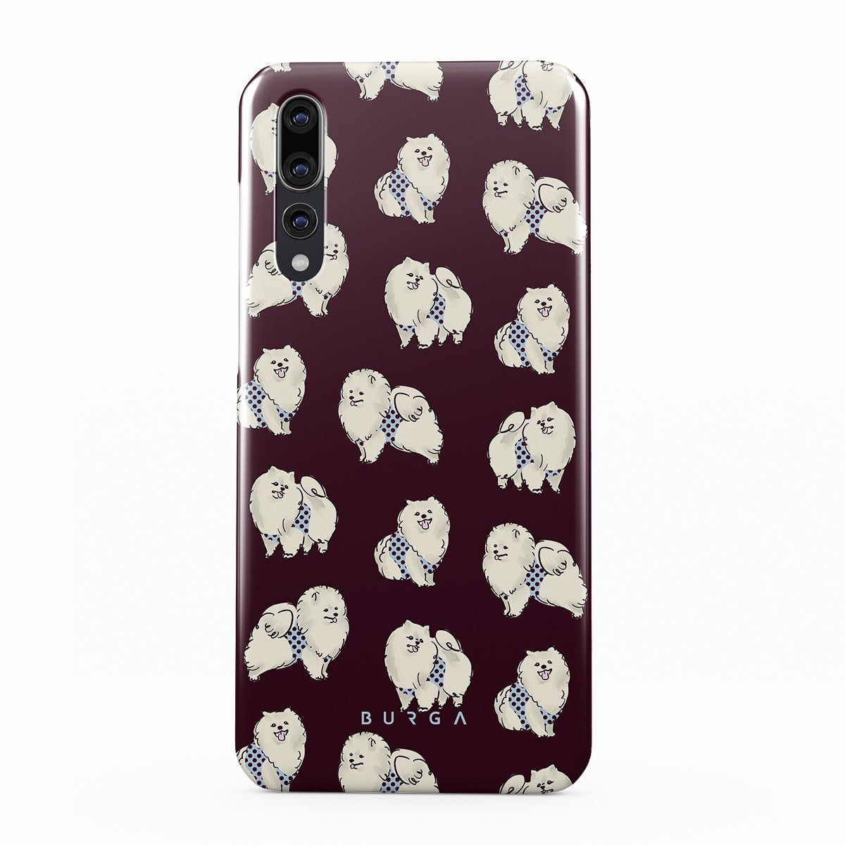 This design features: white fluffy dogs on a deep burgundy background, poodles, pets.