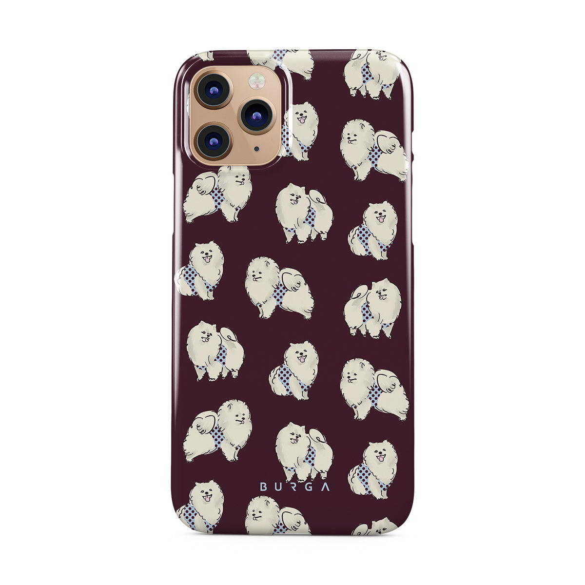 This design features: white fluffy dogs on a deep burgundy background, poodles, pets.