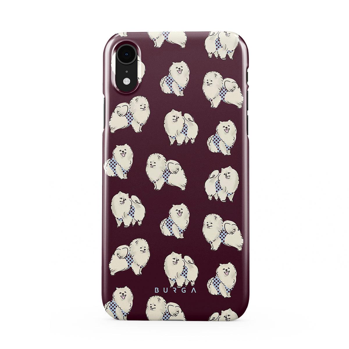 This design features: white fluffy dogs on a deep burgundy background, poodles, pets.