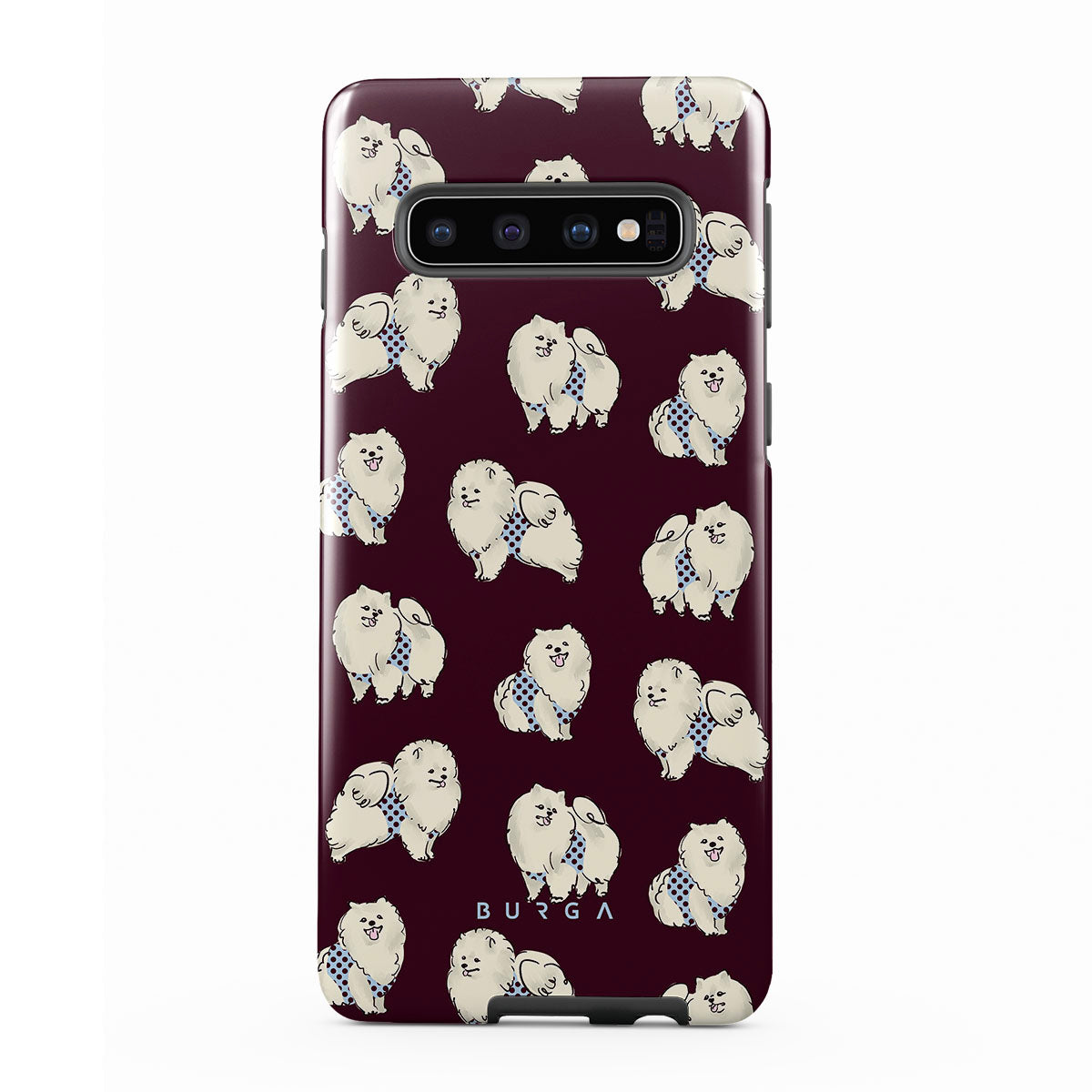 This design features: white fluffy dogs on a deep burgundy background, poodles, pets.