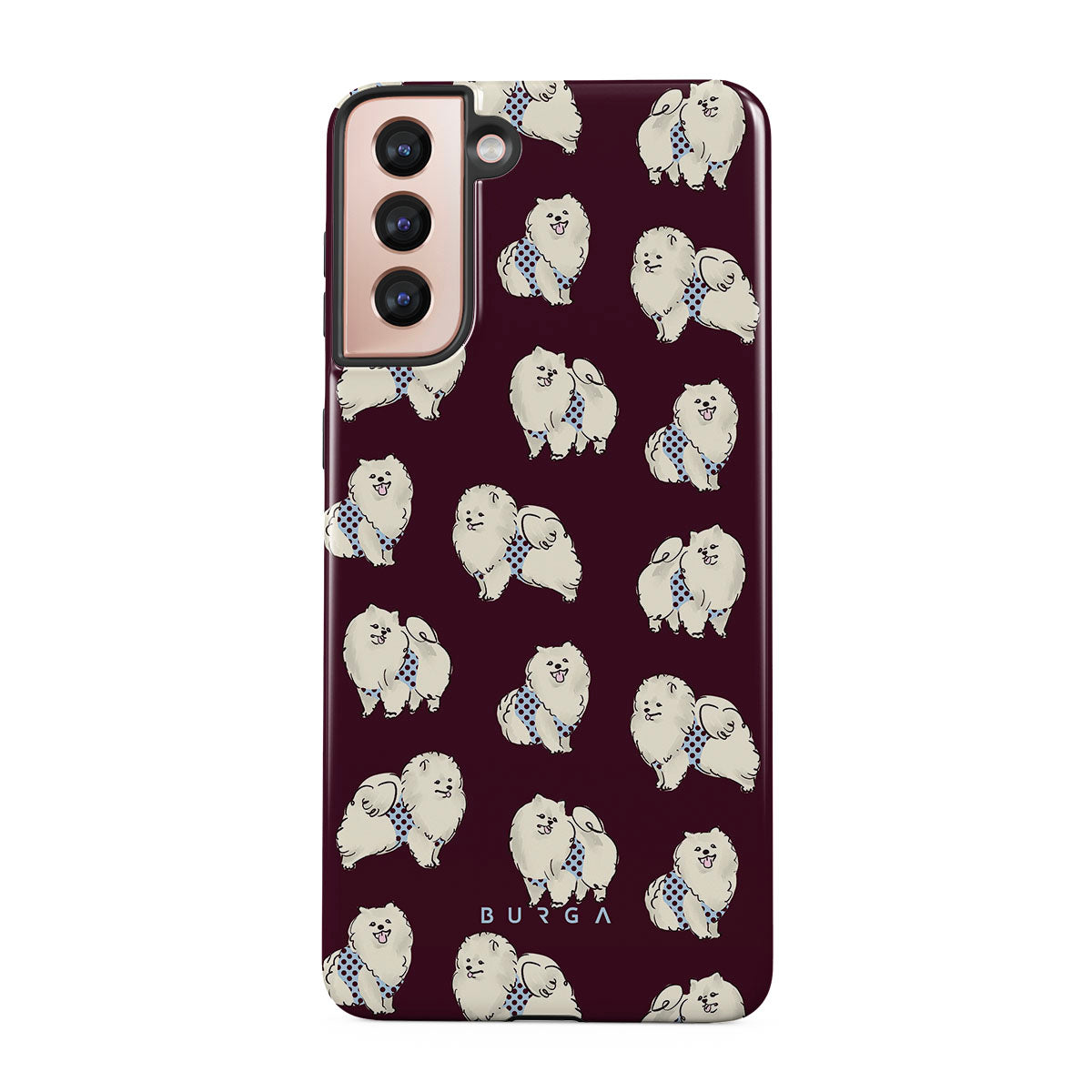 This design features: white fluffy dogs on a deep burgundy background, poodles, pets.