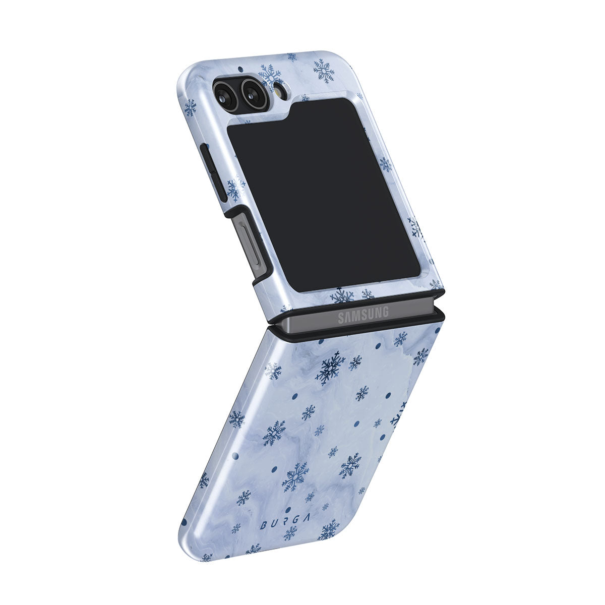 Our Ice Queen Samsung Galaxy Z Flip 5 phone case combines the softest light blue marble design with a minimalistic snowflake pattern, this way creating the ever-mesmerizing effect of elegant snowflakes dance that only the magical winter days are known for. Keep your device looking elegant while keeping it safe and sound.