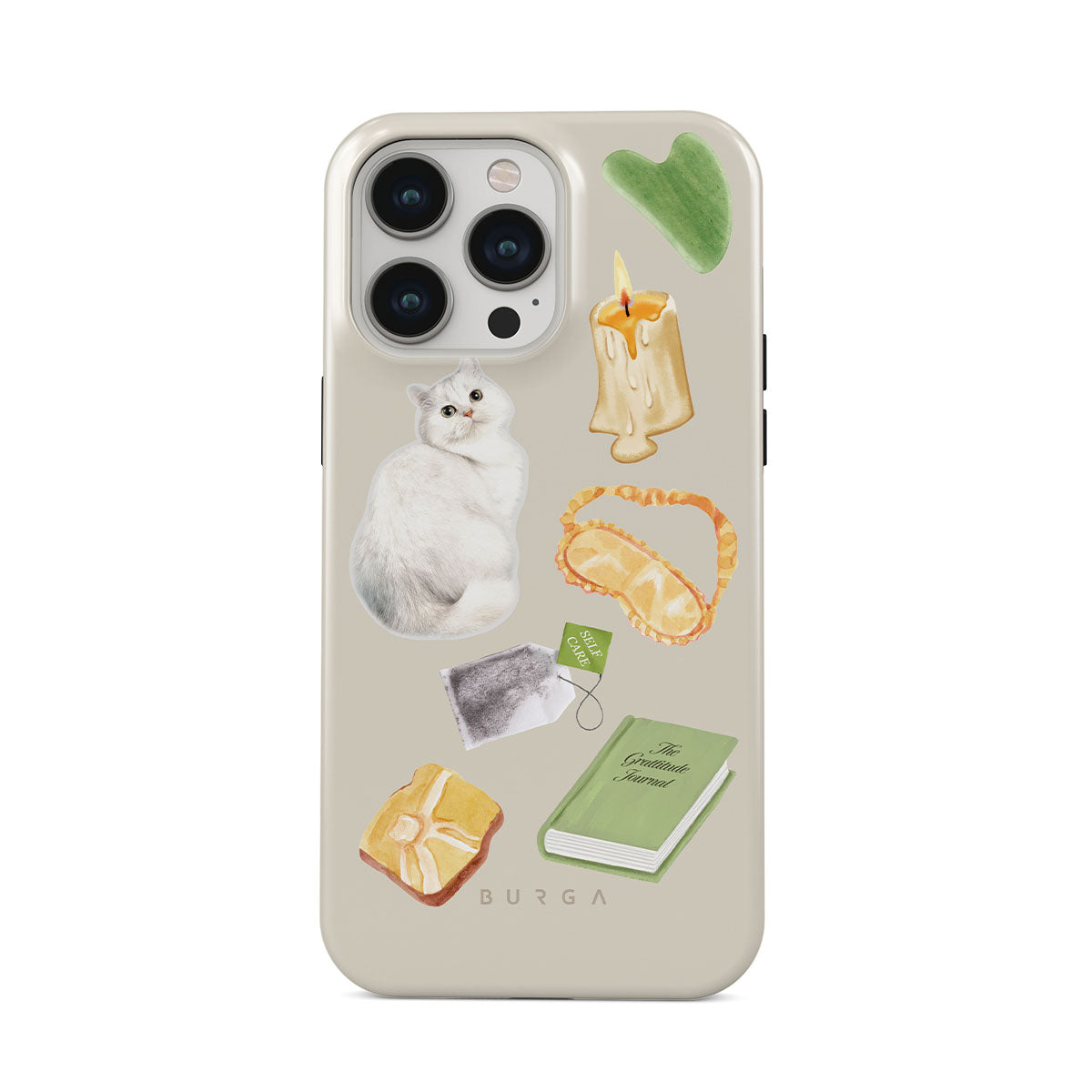 This design features: white cat, green book, candle, Gua Sha bar, sleeping mask, tea bag, yellow crystal