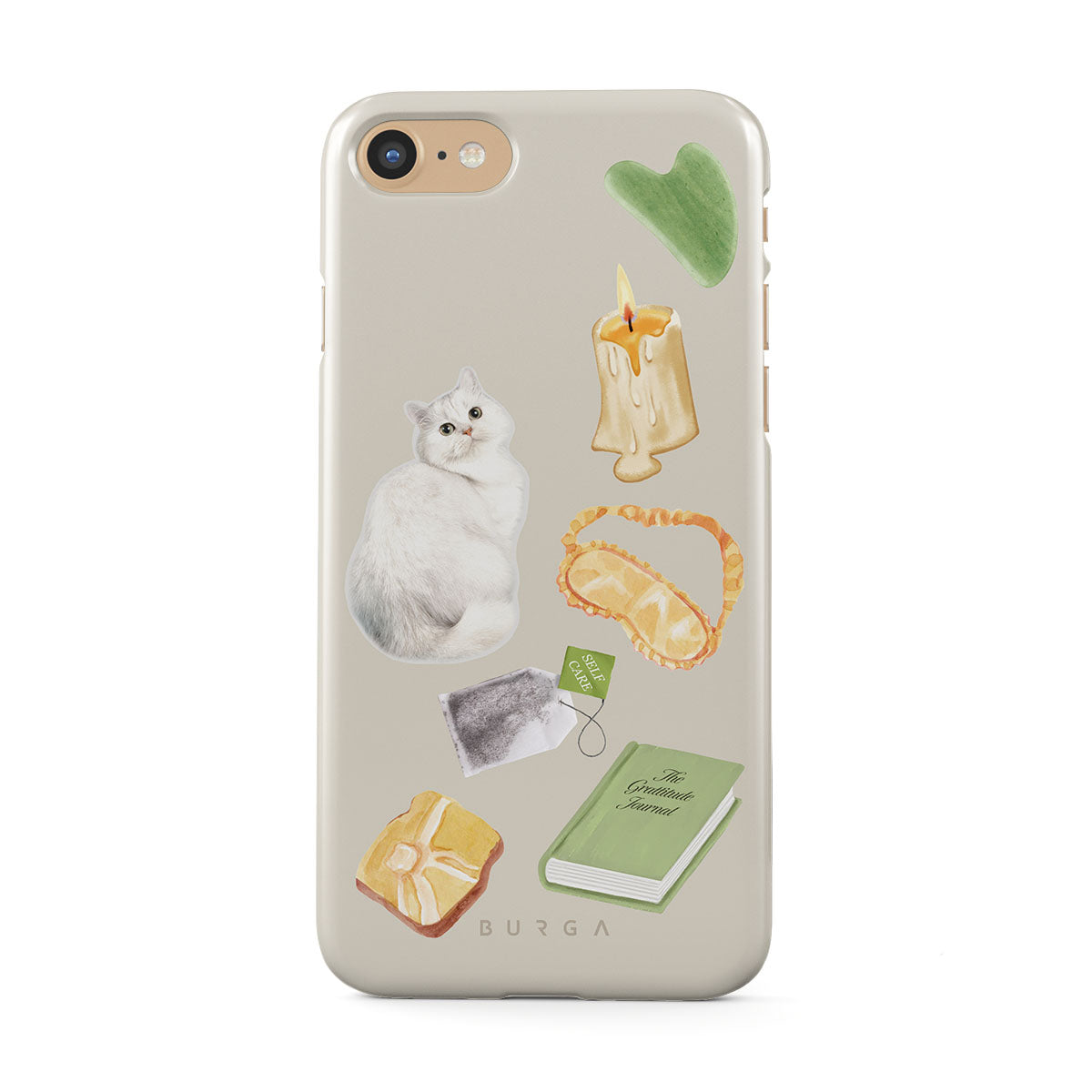 This design features: white cat, green book, candle, Gua Sha bar, sleeping mask, tea bag, yellow crystal