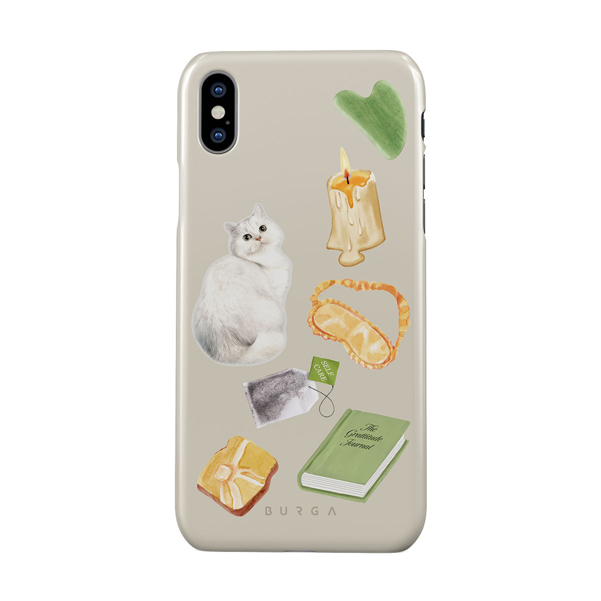 This design features: white cat, green book, candle, Gua Sha bar, sleeping mask, tea bag, yellow crystal