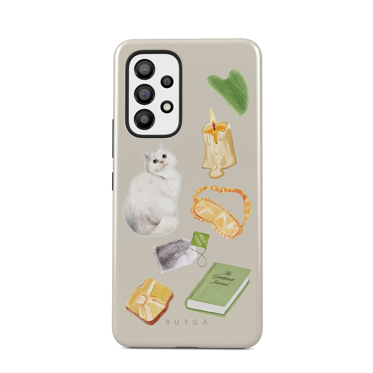 This design features: white cat, green book, candle, Gua Sha bar, sleeping mask, tea bag, yellow crystal