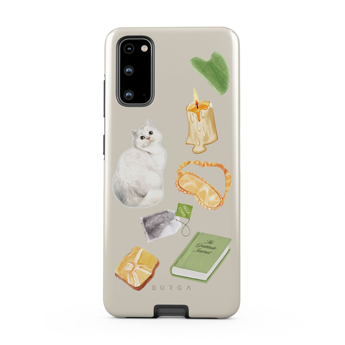 This design features: white cat, green book, candle, Gua Sha bar, sleeping mask, tea bag, yellow crystal