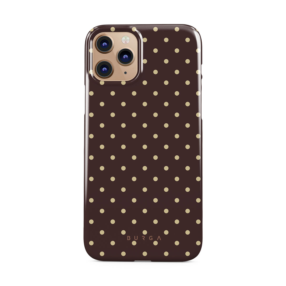 Playful yet polished, our Sorry Busy iPhone 11 Pro Max phone case design features a warm brown background sprinkled with delicate beige polka dots, blending charm with a professional edge. It's for those who keep it stylish, even when fully booked and thriving.