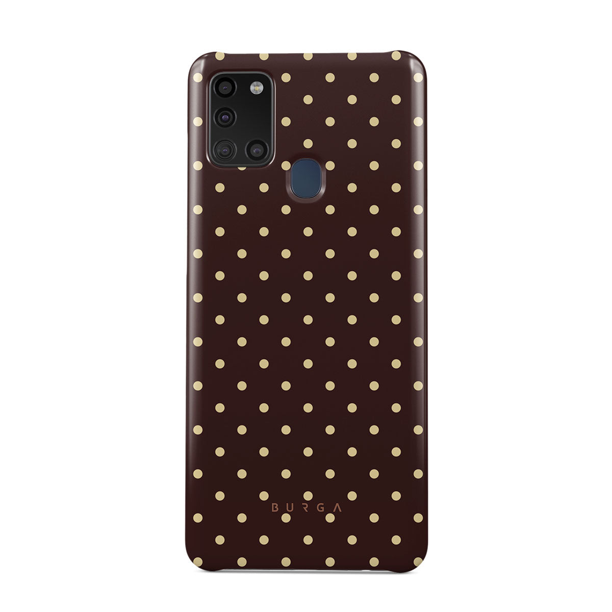 Playful yet polished, our Sorry Busy Samsung Galaxy A21s 4G phone case design features a warm brown background sprinkled with delicate beige polka dots, blending charm with a professional edge. It's for those who keep it stylish, even when fully booked and thriving.