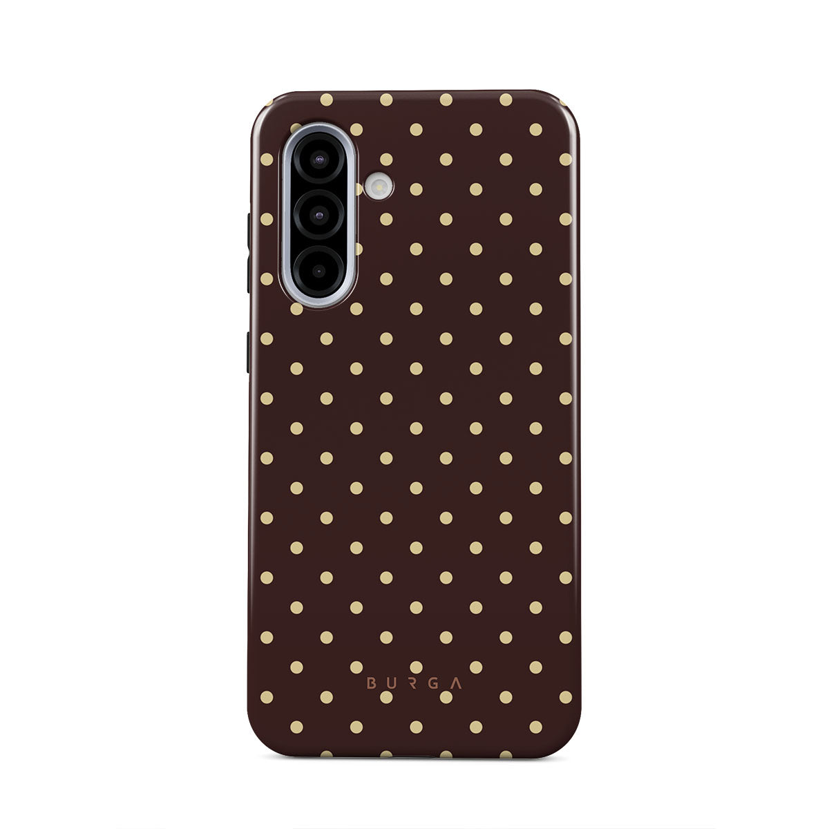 Playful yet polished, our Sorry Busy Samsung Galaxy A36 5G phone case design features a warm brown background sprinkled with delicate beige polka dots, blending charm with a professional edge. It's for those who keep it stylish, even when fully booked and thriving.