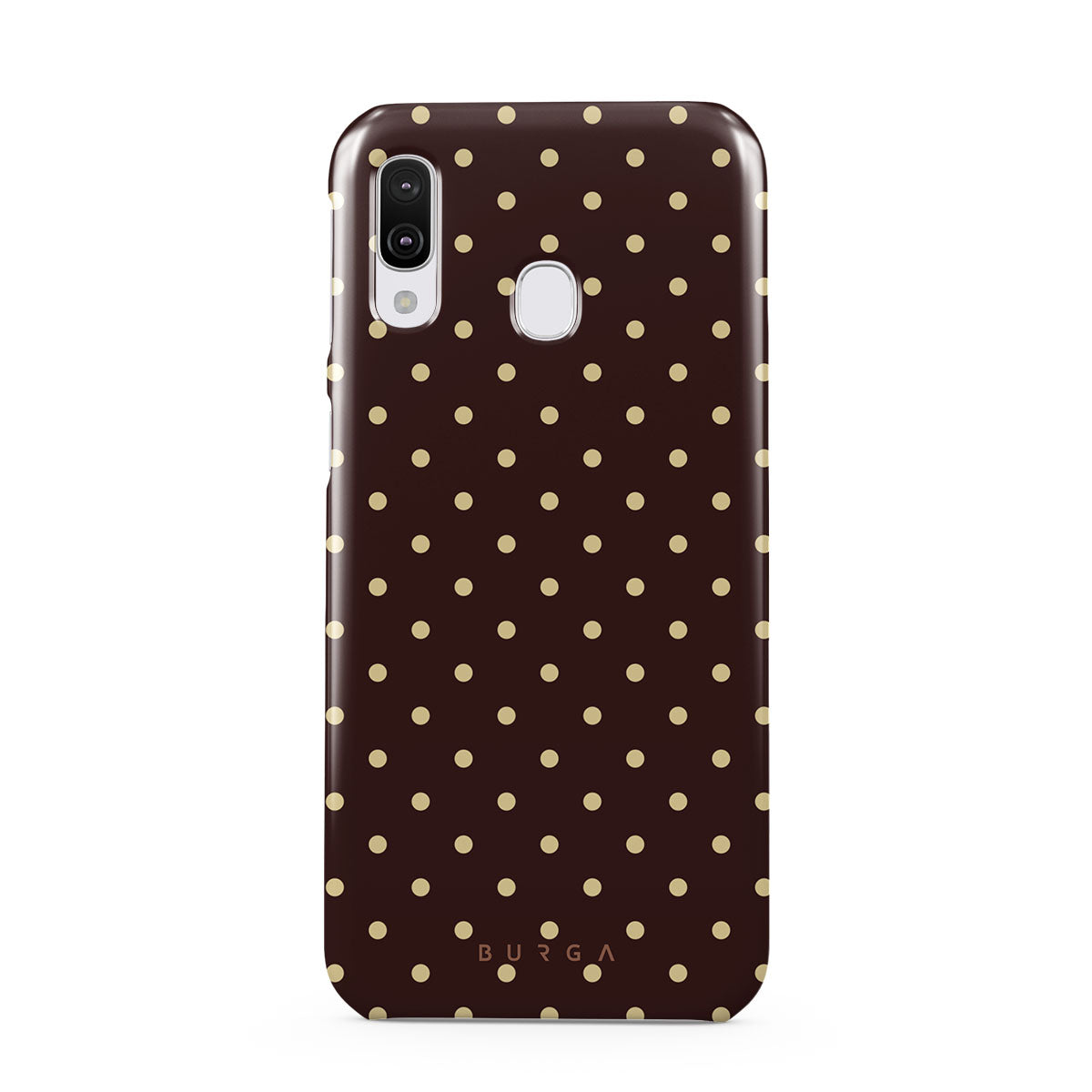 Playful yet polished, our Sorry Busy Samsung Galaxy A40 phone case design features a warm brown background sprinkled with delicate beige polka dots, blending charm with a professional edge. It's for those who keep it stylish, even when fully booked and thriving.