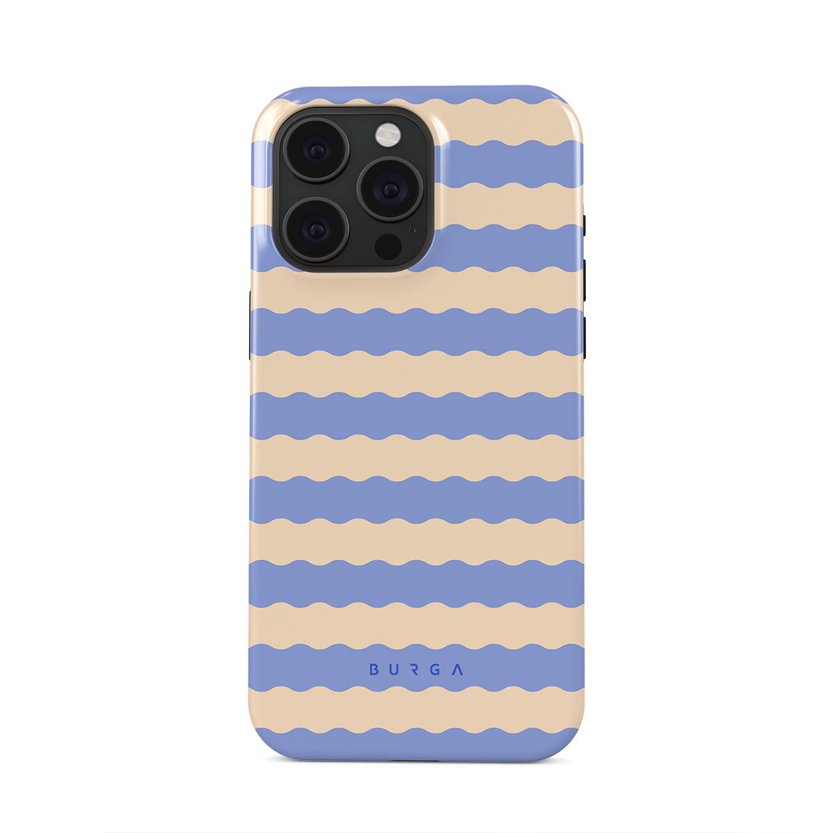 Dive into the cool, refreshing style of our Splash design–a dynamic iPhone 15 Pro phone case featuring playful, wavy stripes of serene ocean blue and soft sandy beige. Perfect for those who love to make a splash with their accessories.