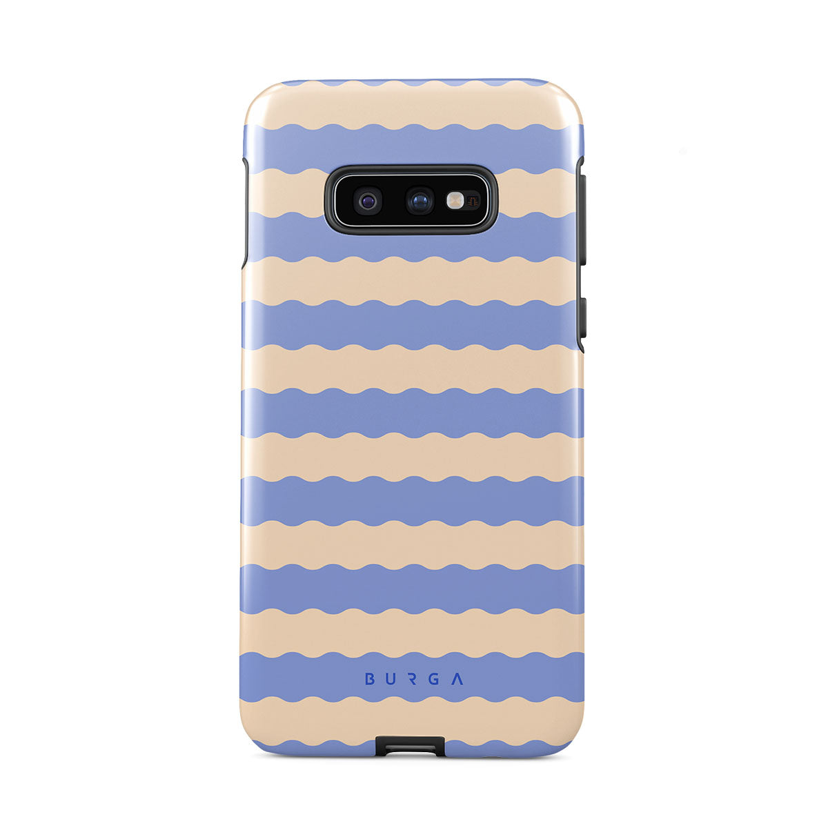 Dive into the cool, refreshing style of our Splash design–a dynamic Samsung Galaxy S10E phone case featuring playful, wavy stripes of serene ocean blue and soft sandy beige. Perfect for those who love to make a splash with their accessories.