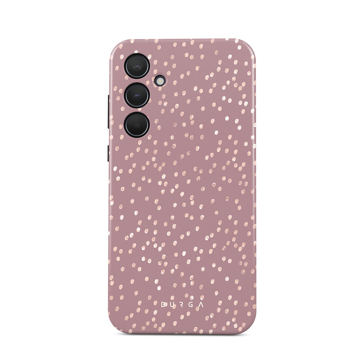 Trendy mauve color as a background for the gold-colored spots creates true beauty. Make your Samsung Galaxy A51 stand out with our protective and pretty Hot Cocoa phone case. The spotted pattern adds a touch of luxury to your phone, while the case's hard-shell nature offers much-needed protection.