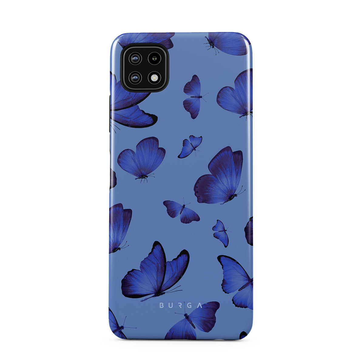 Bright blue butterflies dance across a sky-blue expanse, a visual representation of freedom and transformation. Our Spring Court Samsung Galaxy A22 5G phone case design symbolizes the soul's eternal dance with change, each flutter a step towards becoming who we are meant to be.