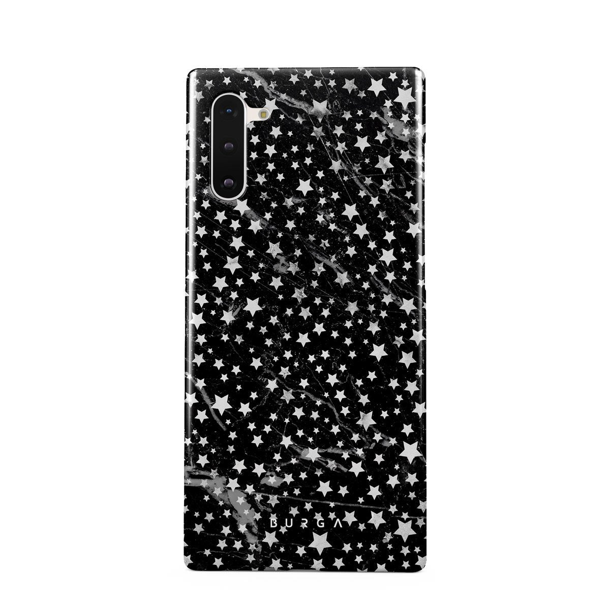 Samsung Galaxy Note 10 phone case is inspired by the sky above us. Here the charming star pattern meets with a trendy black and white marble. Add the unique combination to your wardrobe and transform your protective phone case into a fashion accessory.