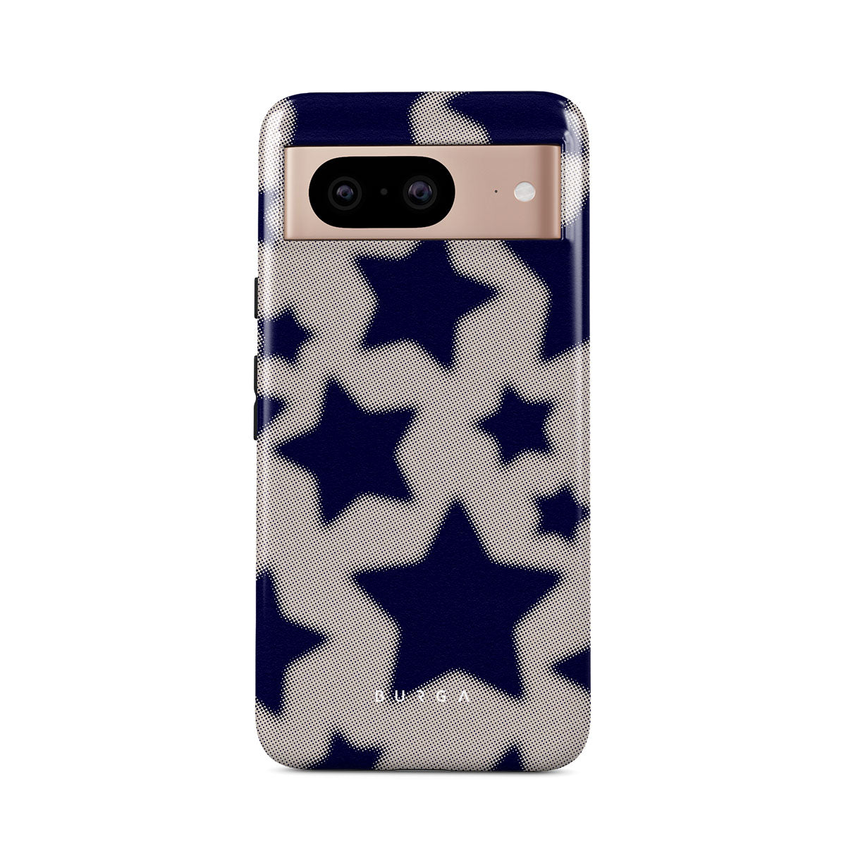 Rock a touch of '90s nostalgia with the Starstruck Google Pixel 8 phone case design. Its nude background is scattered with bold blue stars; each star hints at stories of hope and youthful dreams, blending simplicity with depth.