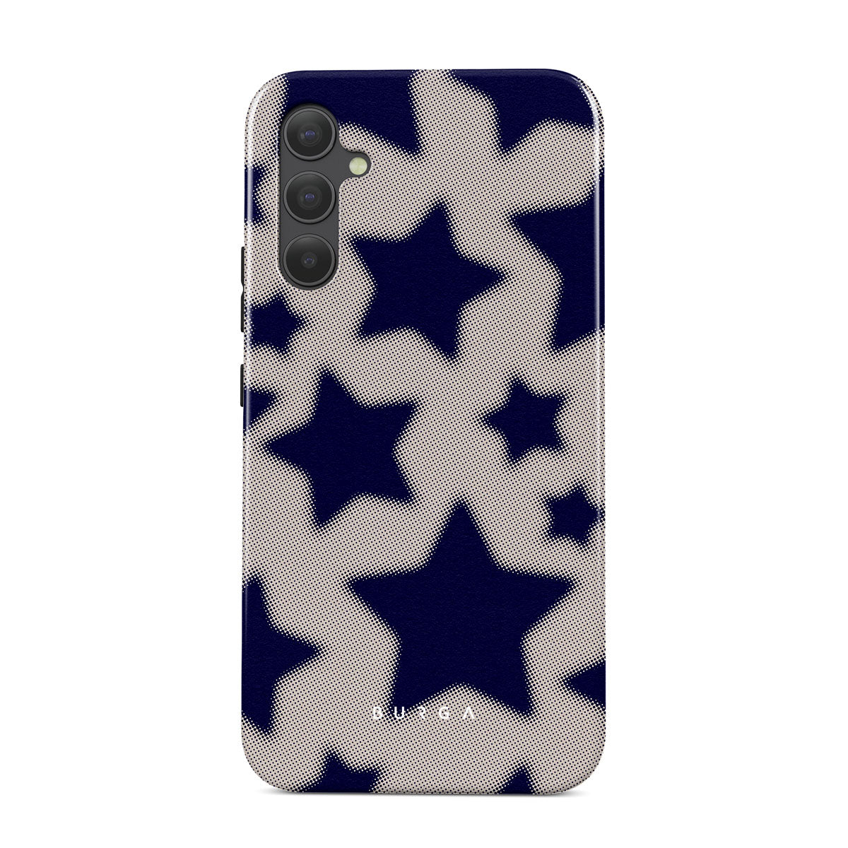 Rock a touch of '90s nostalgia with the Starstruck Samsung Galaxy A34 phone case design. Its nude background is scattered with bold blue stars; each star hints at stories of hope and youthful dreams, blending simplicity with depth.