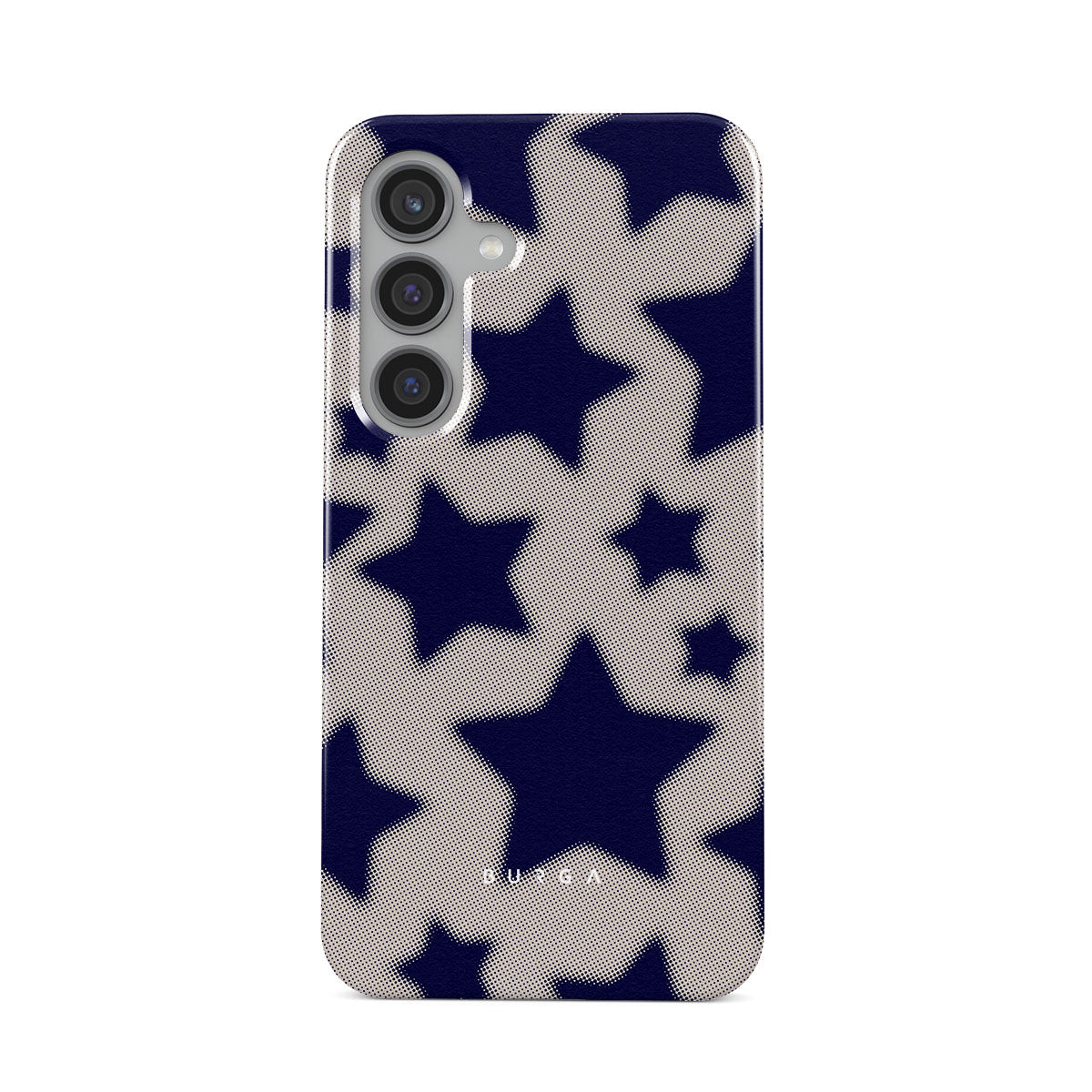 Rock a touch of '90s nostalgia with the Starstruck Samsung Galaxy S24 phone case design. Its nude background is scattered with bold blue stars; each star hints at stories of hope and youthful dreams, blending simplicity with depth.