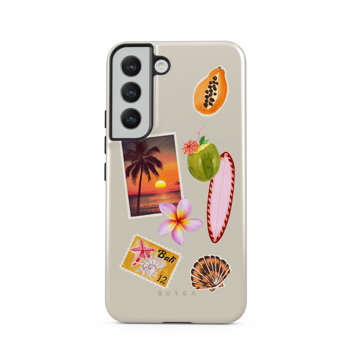This design features: tropical sunset photo, papaya, green coconut, pink surfboard, pink plumeria flower, orange shell, Bali postcard