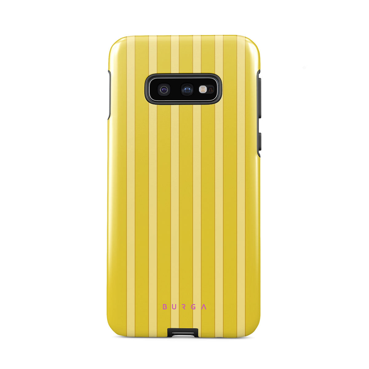 Bask in the glow of Sunbreak. This Samsung Galaxy S10E phone case design features bold yellow stripes, reminiscent of beachside cabanas and sunny summer days. It’s a chic celebration of joy and simplicity.