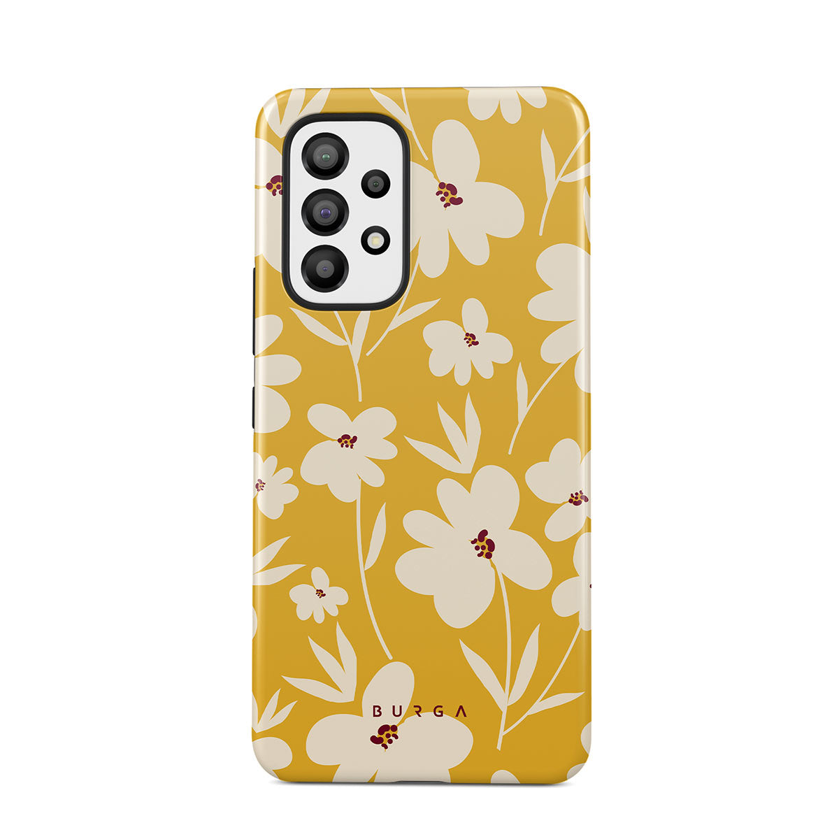 Full of fresh produce, warm rays of sunshine, and relaxing moments, our Sunday Market Samsung Galaxy A33 phone case encase all of this! The vintage mustard-yellow background with beautiful creme flowers will add that soft floral touch to your wardrobe while protecting your device from unexpected falls!