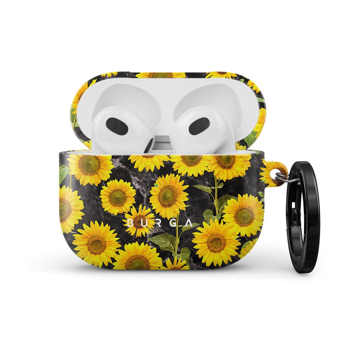 Add a burst of sunshine to your pocket with our Sunflower Glimmer Apple Airpods 3 case cover. The radiating sunflower pattern will brighten any day while also protecting your case—no more choosing protection over style. Our case fits perfectly snug around Apple Airpods 3 . “Like a glove!” one might say. And it won’t disrupt the wireless charging capabilities of the newer model. There’s even an LED light indicator to prove it (don’t worry, wired charging still works, too). When fitted, the BURGA case will protect the delicate Apple Airpods 3 case beneath it from scratches, bumps, and drops while remaining scratch-free itself. Our signature design pattern prints are High Quality, and will never peel or fade away- thanks to our unique printing technology. And finally, a handy carabiner is there to make your life easier and more convenient: just snap it around your keys or belt loop and tackle the day head-on. Your music is right there by your side when you need it.