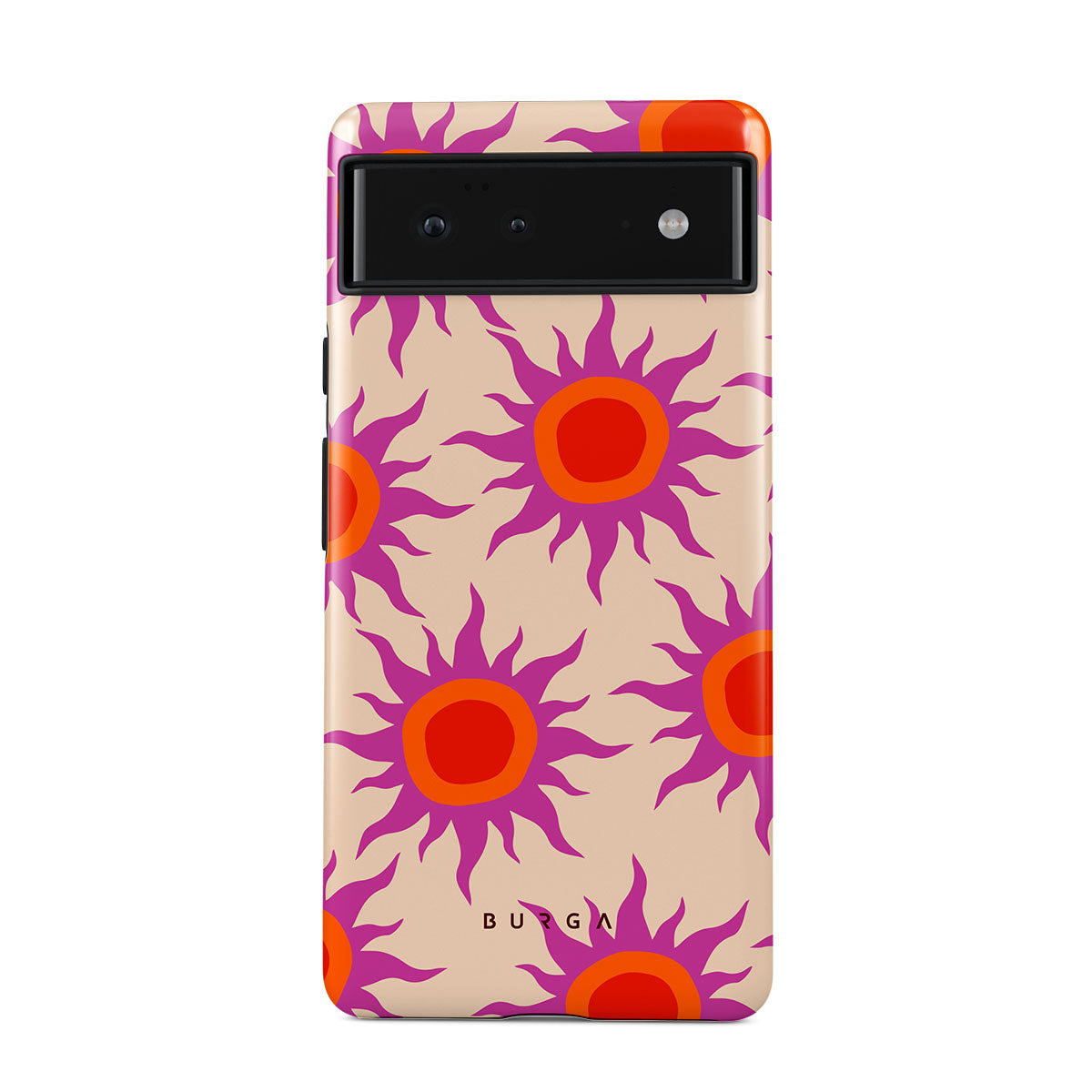 Discover the radiant serenity of the Sunset Glow design, a harmonious blend of soothing pastels and fiery suns. Vivacious viva magenta rays add a playful touch, perfectly balancing tranquility and dynamism. More than just a fashion accessory, this striking Google Pixel 6 phone case mirrors your unique personality and zest for life.