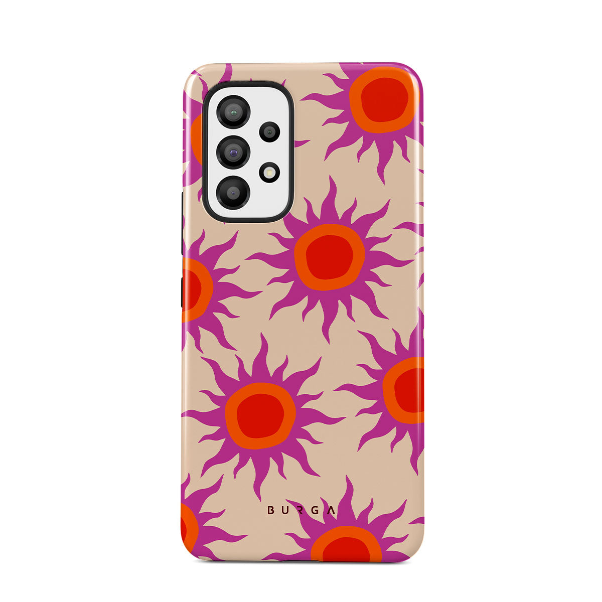 Discover the radiant serenity of the Sunset Glow design, a harmonious blend of soothing pastels and fiery suns. Vivacious viva magenta rays add a playful touch, perfectly balancing tranquility and dynamism. More than just a fashion accessory, this striking Samsung Galaxy A23 4G / 5G phone case mirrors your unique personality and zest for life.