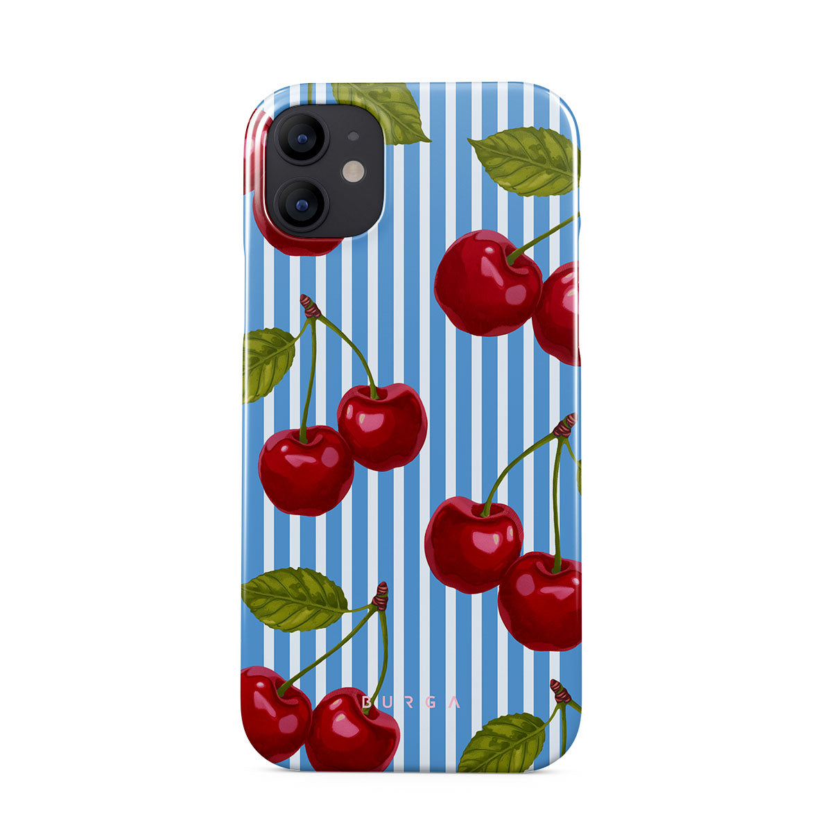 Cherries dangle like earrings from blue skies, a fun reminder of that first bite of summer, juicy and bursting with laughter. Meet our Sweet Moment iPhone 12 Mini phone case design.
