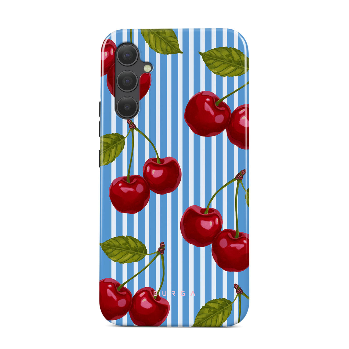 Cherries dangle like earrings from blue skies, a fun reminder of that first bite of summer, juicy and bursting with laughter. Meet our Sweet Moment Samsung Galaxy A34 phone case design.