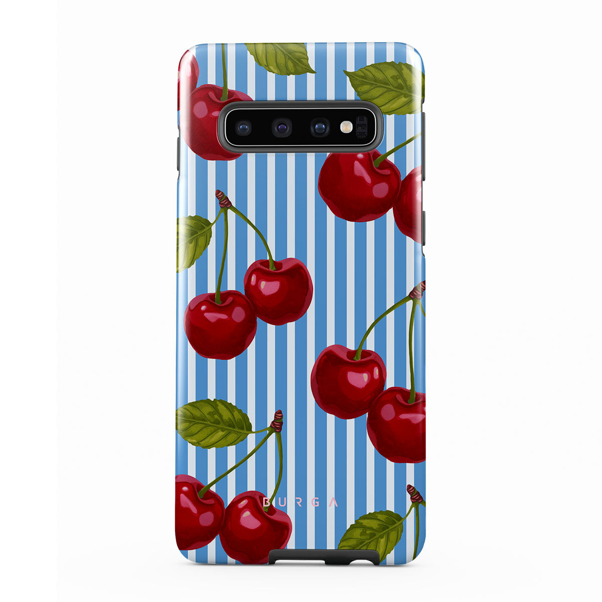 Cherries dangle like earrings from blue skies, a fun reminder of that first bite of summer, juicy and bursting with laughter. Meet our Sweet Moment Samsung Galaxy S10 4G phone case design.