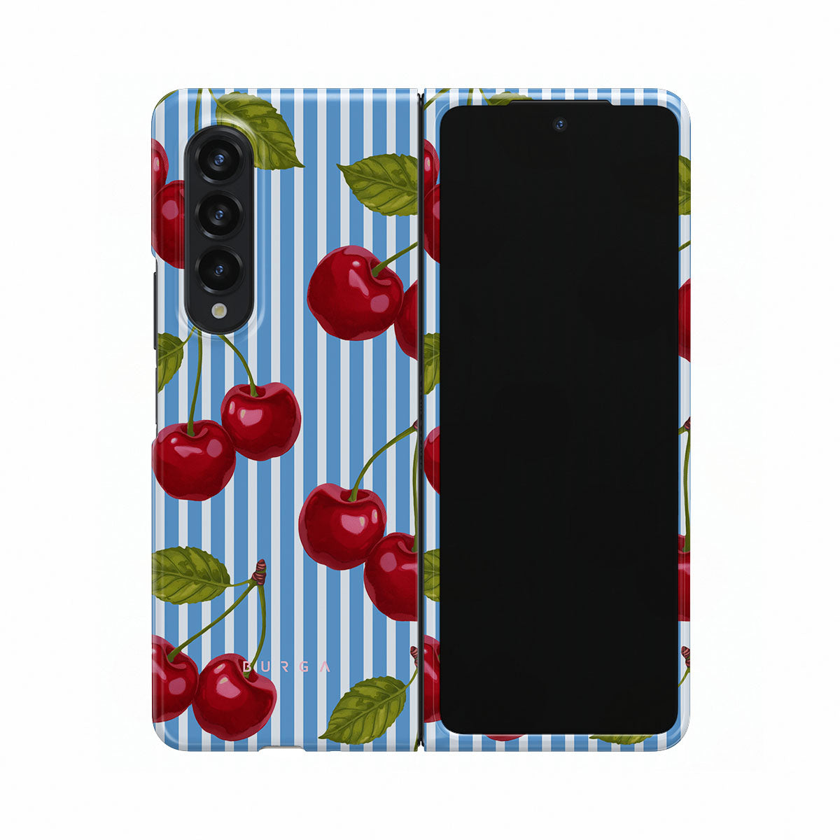 Cherries dangle like earrings from blue skies, a fun reminder of that first bite of summer, juicy and bursting with laughter. Meet our Sweet Moment Samsung Galaxy Z Fold 3 phone case design.