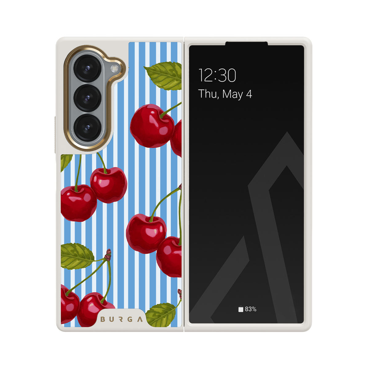 Cherries dangle like earrings from blue skies, a fun reminder of that first bite of summer, juicy and bursting with laughter. Meet our Sweet Moment Samsung Galaxy Z Fold 6 phone case design.