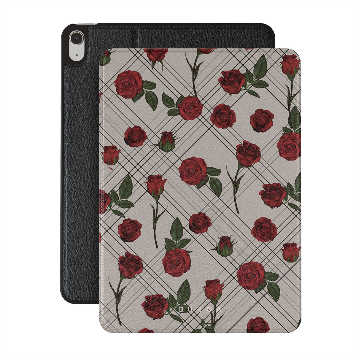 Embrace the subtle rebellion of our Sweet Sin iPad Air 10.9 (5th/4th Gen) folio case design. On a muted nude-gray canvas, scattered small red roses hint at passions hidden beneath the surface. A design that balances the delicate with the daring. Crafted for those who find beauty in the unexpected and wear their edge with elegance.