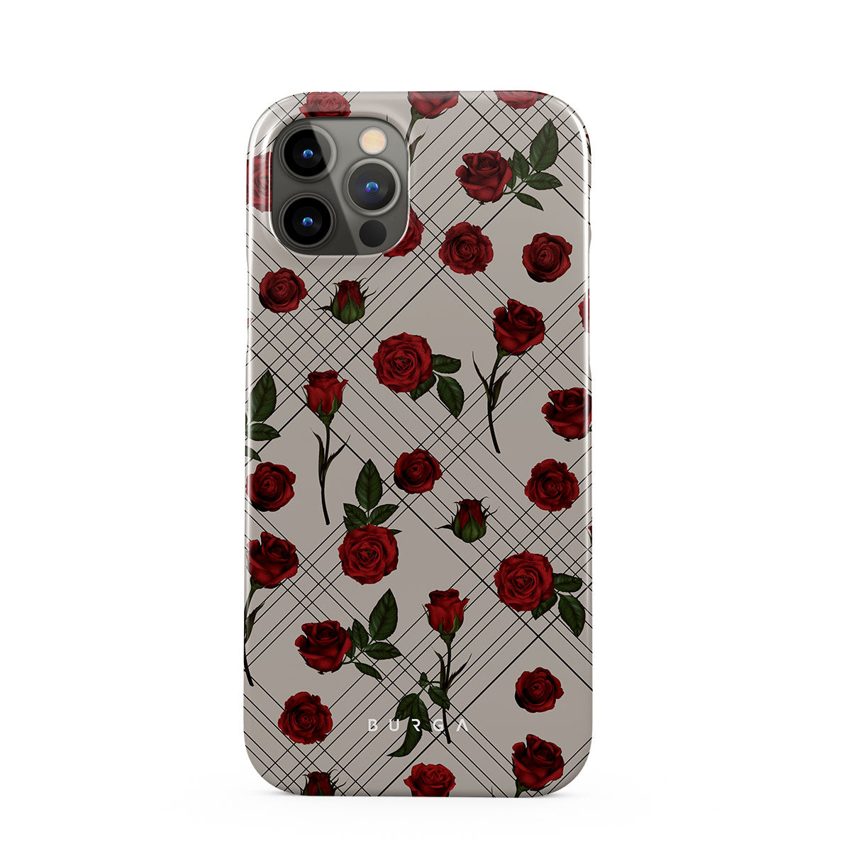 Embrace the subtle rebellion of our Sweet Sin iPhone 12 Pro Max phone case design. On a muted nude-gray canvas, scattered small red roses hint at passions hidden beneath the surface. A design that balances the delicate with the daring. Crafted for those who find beauty in the unexpected and wear their edge with elegance.